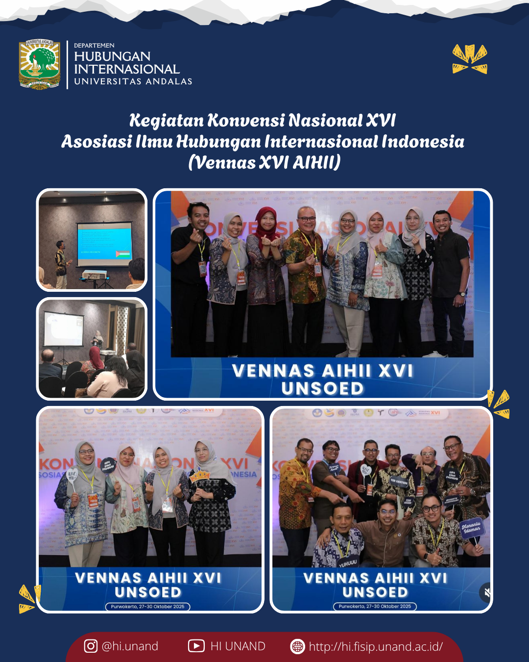 Purwokerto, 27–31 Oktober 2025 — Departemen Hubungan Internasional Universitas Andalas (HI UNAND) turut berpartisipasi aktif dalam Konvensi Nasional XVI Asosiasi Ilmu Hubungan Internasional Indonesia (Vennas XVI AIHII) yang diselenggarakan di Universitas Jenderal Soedirman (UNSOED), Purwokerto, Jawa Tengah. Kegiatan tahunan berskala…