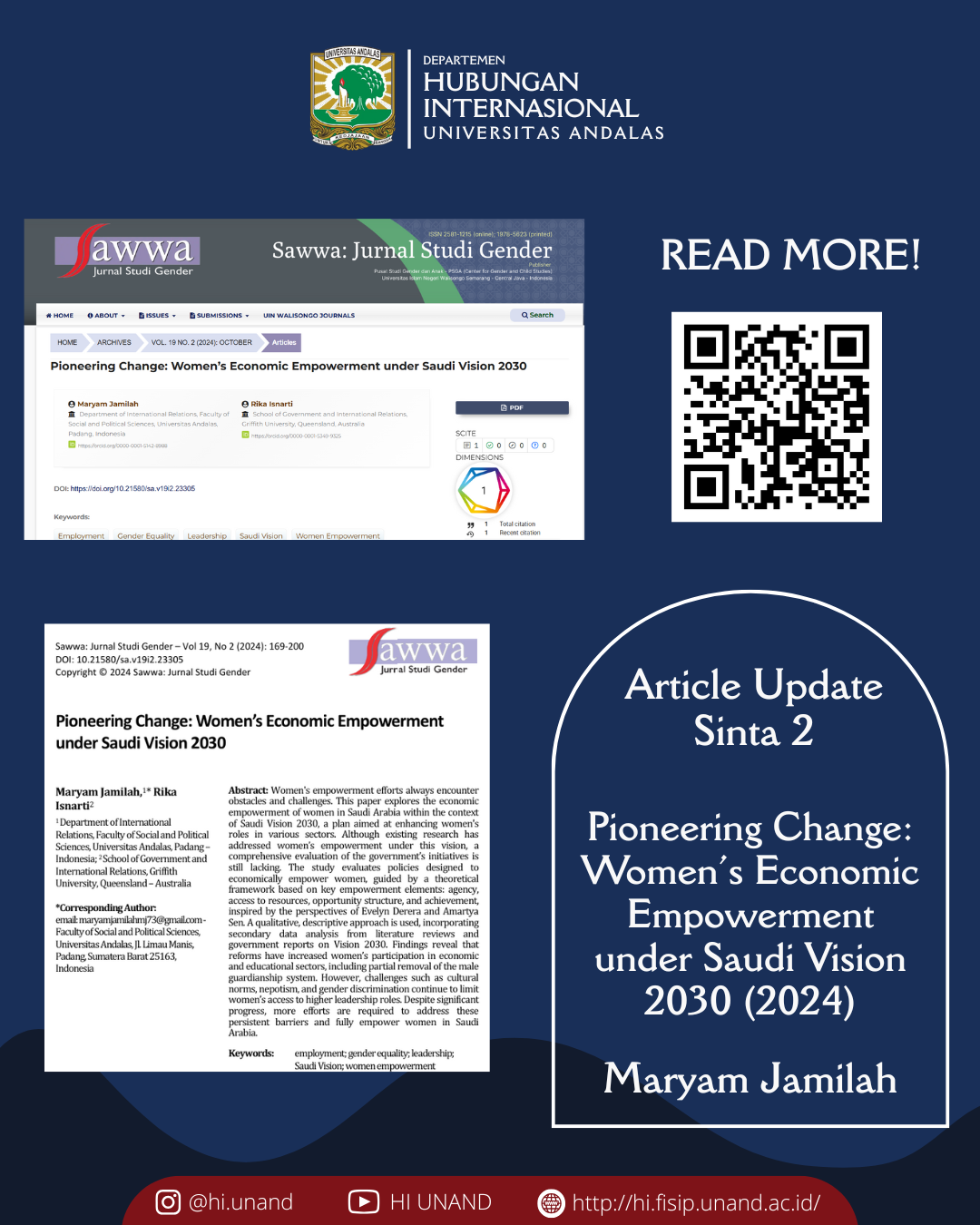 Sementara itu, Maryam Jamilah menunjukkan kepakaran dalam isu gender dan Timur Tengah melalui dua publikasi unggulan. Artikel pertama berjudul “Pioneering Change: Women’s Economic Empowerment under Saudi Vision 2030” yang diterbitkan di Sawwa: Jurnal Studi Gender (Sinta 2, 2024) membahas pemberdayaan ekonomi perempuan di Arab Saudi dalam kerangka Saudi Vision 2030.