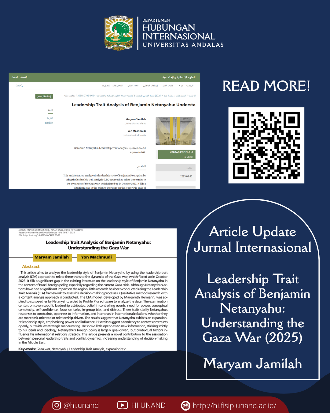 Artikel kedua berjudul “Leadership Trait Analysis of Benjamin Netanyahu: Understanding the Gaza War” (2025) diterbitkan di jurnal internasional dan menganalisis gaya kepemimpinan Benjamin Netanyahu dalam konteks konflik Gaza menggunakan pendekatan Leadership Trait Analysis (LTA).