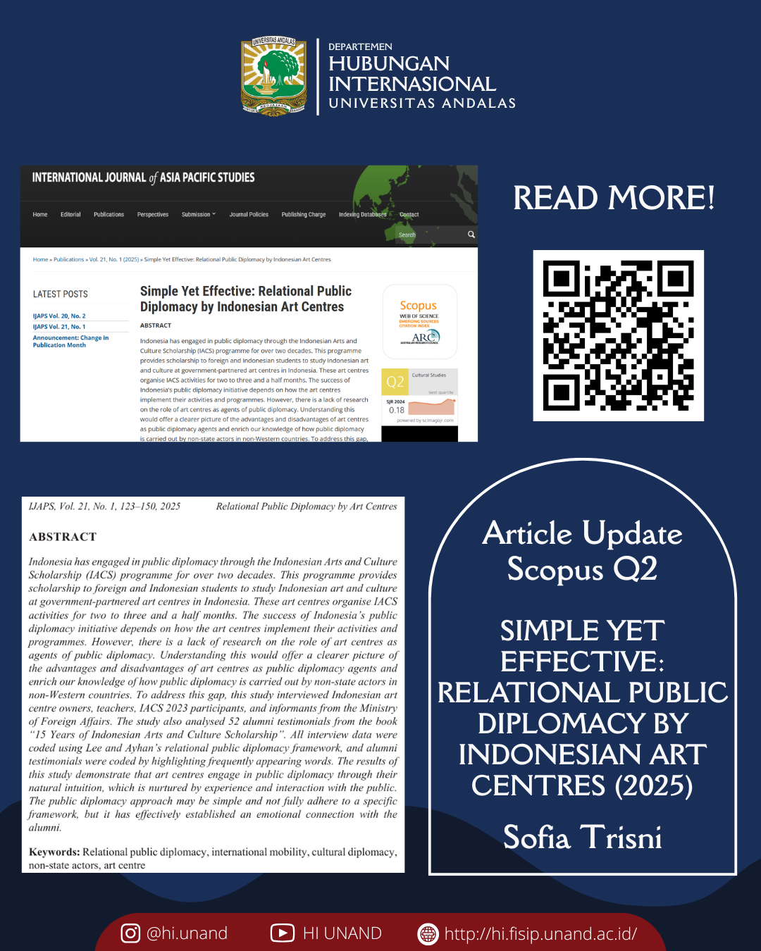 Sofia Trisni mencatat capaian penting melalui artikel ilmiahnya berjudul “Simple Yet Effective: Relational Public Diplomacy by Indonesian Art Centres”, yang diterbitkan di International Journal of Asia Pacific Studies (Scopus Q2). Artikel ini mengulas diplomasi publik Indonesia melalui pusat seni dan budaya sebagai sarana mempererat hubungan antarnegara serta memperluas pemahaman lintas budaya.