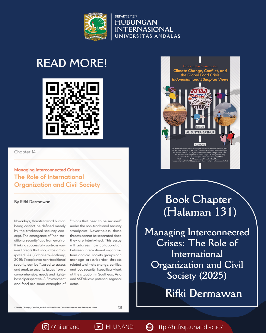 Selain itu, Rifki juga berkontribusi dalam buku Crisis at the Crossroads: Climate Change, Conflict, and the Global Food Crisis (2025) melalui bab berjudul “Managing Interconnected Crises: The Role of International Organization and Civil Society” (halaman 131) yang mengulas peran organisasi internasional dan masyarakat sipil dalam menghadapi ancaman keamanan non-tradisional seperti krisis iklim dan pangan global.