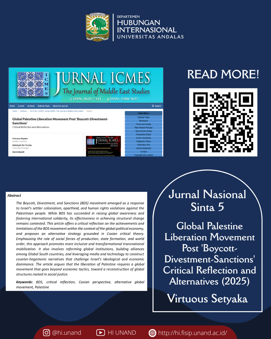 Dosen HI lainnya, Virtuous Setyaka, turut memperkaya diskursus internasional dengan artikelnya berjudul “Global Palestine Liberation Movement Post ‘Boycott-Divestment-Sanctions’: Critical Reflection and Alternatives” yang terbit pada Jurnal ICMES (The Journal of Middle East Studies, Sinta 5) tahun 2025. Tulisan ini memberikan refleksi kritis atas gerakan solidaritas global untuk Palestina dan mengusulkan strategi baru yang lebih inklusif dalam perjuangan kemerdekaan rakyat Palestina di kancah global.