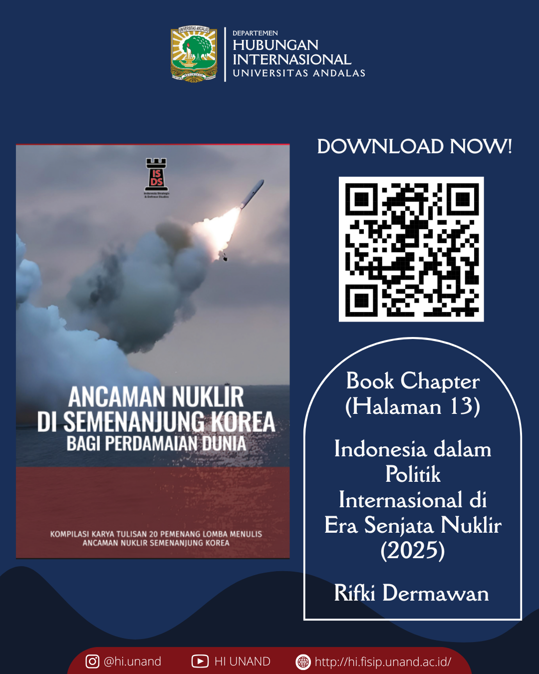Rifki Dermawan, dosen HI Unand, berhasil menerbitkan dua karya penting pada tahun 2025. Pertama, dalam Book Chapter “Indonesia dalam Politik Internasional di Era Senjata Nuklir” (halaman 13) yang dimuat dalam buku Ancaman Nuklir di Semenanjung Korea bagi Perdamaian Dunia. Tulisan ini membahas posisi dan strategi Indonesia di tengah tantangan era senjata nuklir, serta refleksi diplomasi damai di kawasan Asia Timur.