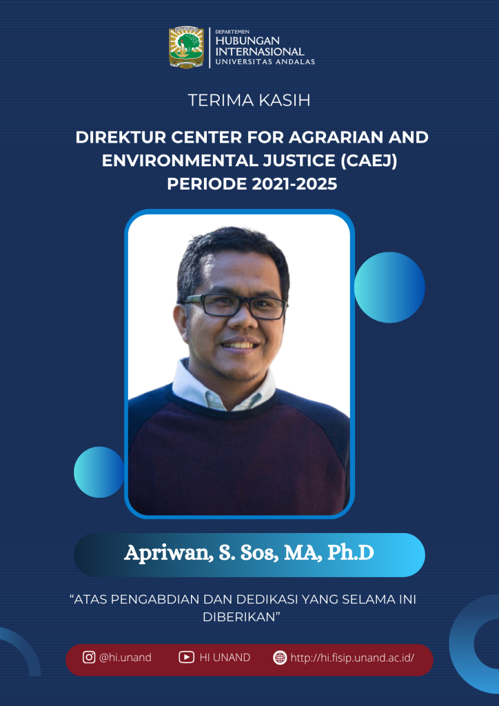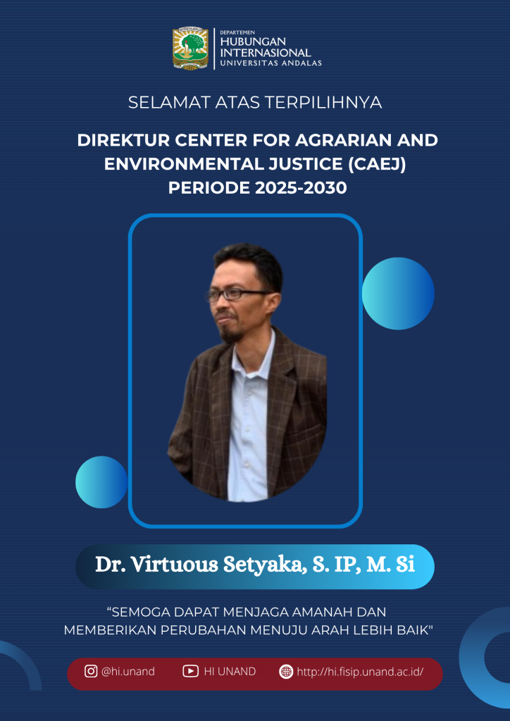 Departemen Hubungan Internasional Universitas Andalas menyampaikan ucapan selamat kepada Dr. Virtuous Setyaka, S.IP., M.Si. atas terpilihnya sebagai Direktur Center for Agrarian and Environmental Justice (CAEJ) untuk periode 2025–2030.