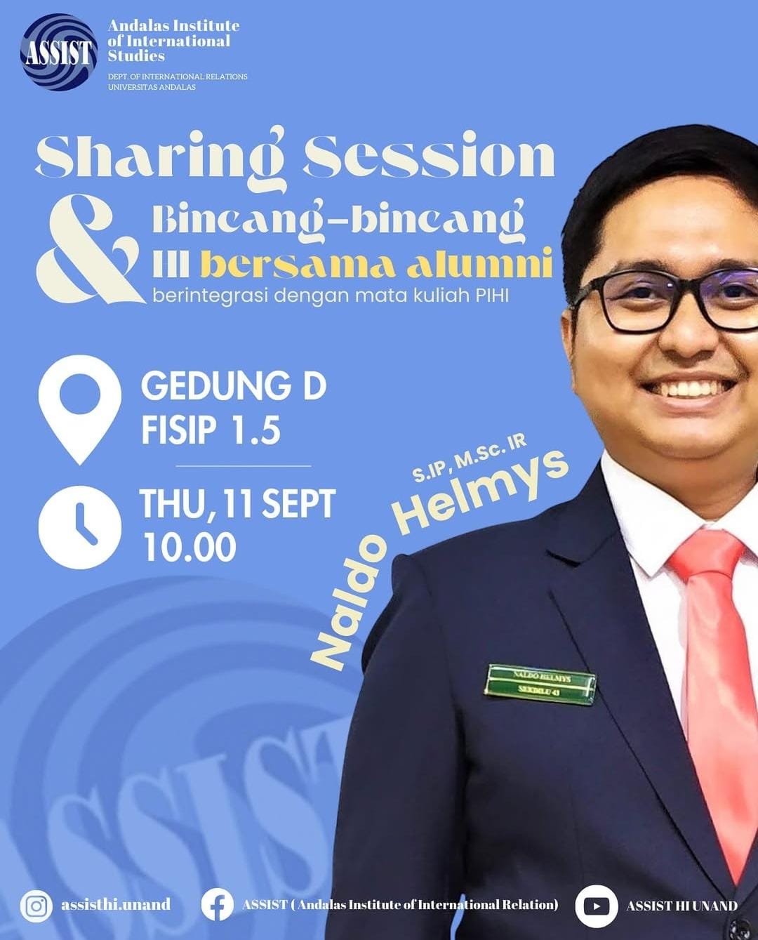 Narasumber dalam kegiatan ini adalah Naldo Helmrys, S.IP., M.Sc. IR, salah satu alumni berprestasi dari Program Studi Hubungan Internasional FISIP Universitas Andalas, yang kini aktif berkiprah di bidang hubungan internasional dan kebijakan publik.