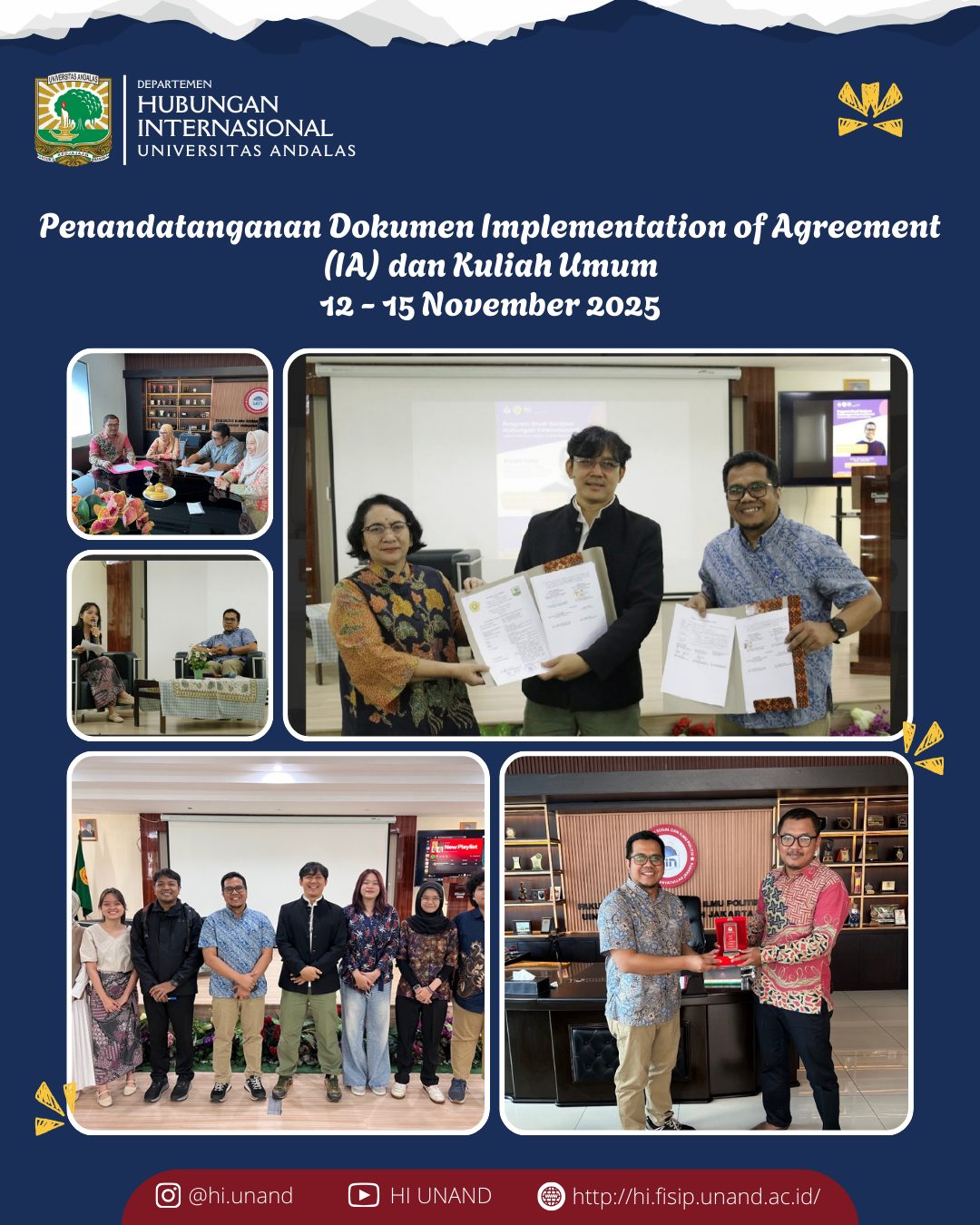 Departemen Hubungan Internasional Fakultas Ilmu Sosial dan Ilmu Politik Universitas Andalas menyelenggarakan rangkaian kegiatan strategis berupa Penandatanganan Implementation of Agreement (IA) dan Kuliah Umum, yang berlangsung pada 12–15 November 2025 di dua kampus mitra: Universitas Pembangunan Nasional “Veteran” Jakarta dan…
