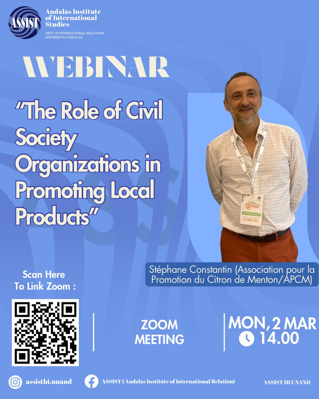 Departemen Hubungan Internasional FISIP Universitas Andalas melalui Andalas Institute of International Studies (ASSIST) telah sukses menyelenggarakan webinar internasional bertajuk “The Role of Civil Society Organizations in Promoting Local Products” pada Senin, 2 Maret, pukul 14.00 WIB melalui platform Zoom Meeting.
