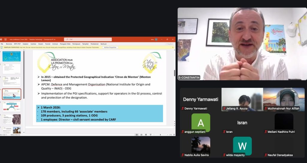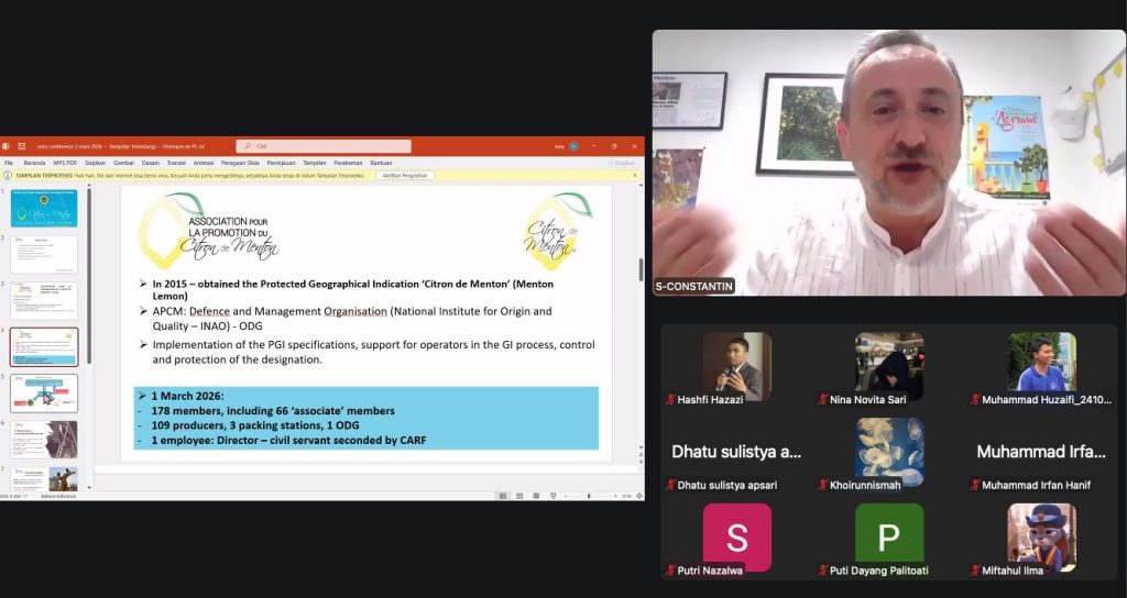Kegiatan ini menghadirkan narasumber internasional, Stéphane Constantin dari Association pour la Promotion du Citron de Menton (APCM), sebuah asosiasi di Prancis yang berfokus pada promosi dan perlindungan produk lokal unggulan, khususnya Citron de Menton.